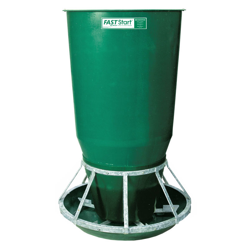 The FAST Start Big Wheel Feeder is manufactured with abrasion-resistant, reinforced fiberglass hoppers and troughs and combination hot dipped galvanized/zinc plated/painted/304 stainless steel metal parts. Shipped knocked-down on a pallet with complete assembly and operating instructions. A hopper lid (FF-00RF3L) is included.